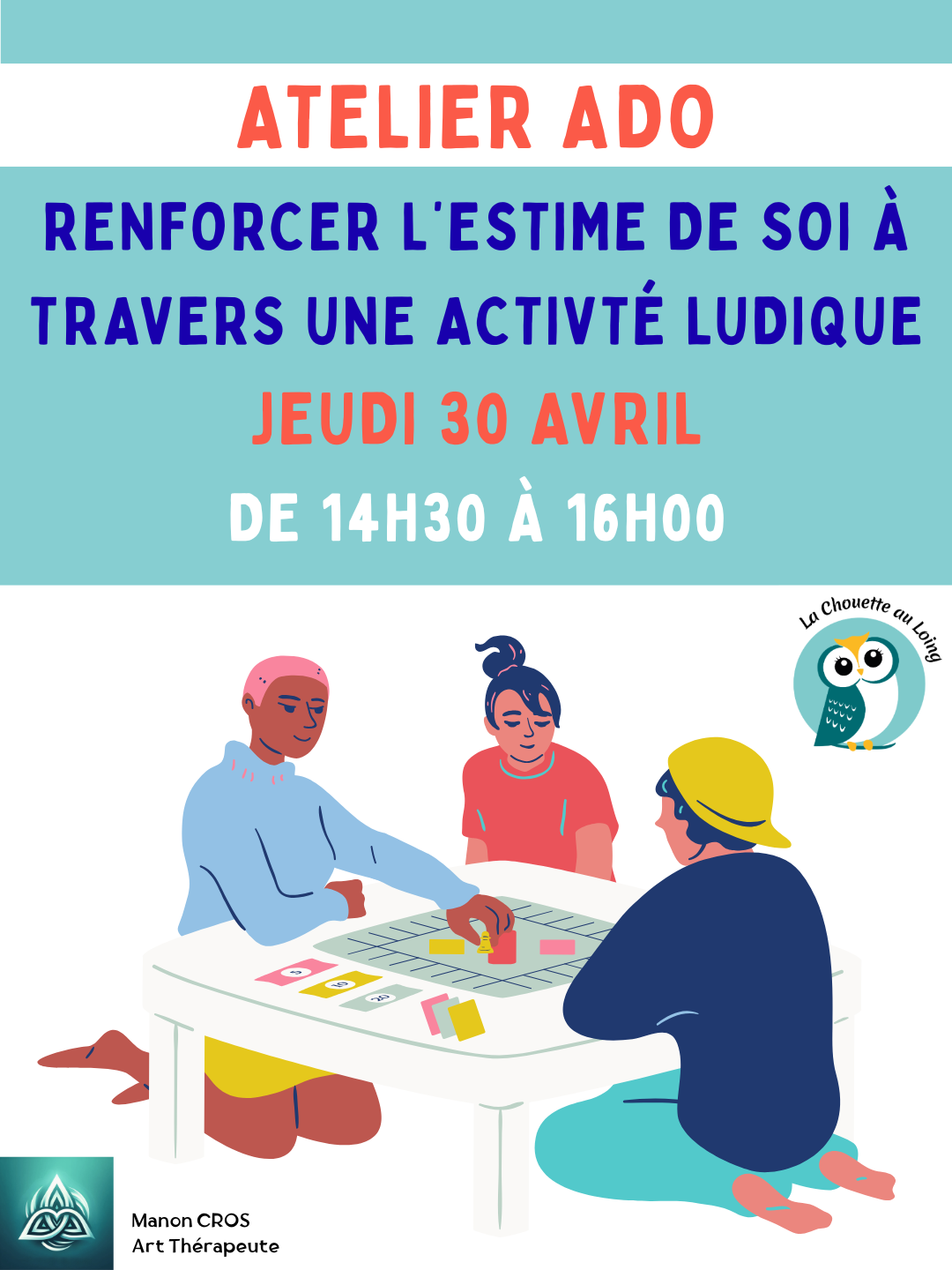 Pendant les vacances scolaires, Manon vous propose un atelier 100% ados (à partir de 12 ans). A travers une activité ludique (jeu de l'oie revisité) et une proposition créative (l'arbre des réussites), votre enfant se (re)découvre et prend confiance en lui.