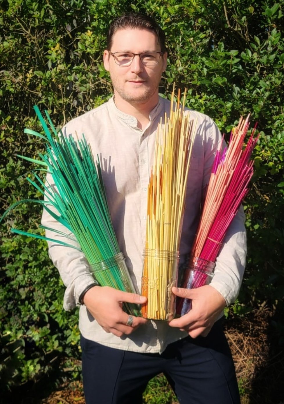 La paille de seigle, matière naturelle et lumineuse, est au cœur de chacune des créations de Julien. Il façonne à la main des bijoux artisanaux, des objets décoratifs uniques et habille de paille du petit mobilier, dans la pure tradition de l’artisanat d’art. Chaque pièce joue avec les reflets et les textures de cette matière singulière, donnant vie à des créations élégantes et intemporelles.
